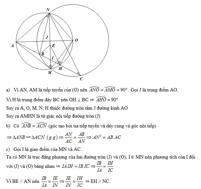 Cho đường tròn (O) và điểm A nằm ngoài đường tròn. Vẽ các tiếp tuyến AM, AN với các đường tròn (O) (M, N ∈ (O)). Qua A vẽ một đường thẳng cắt đường tròn (O) tại hai điểm B, C phân biệt (B nằm giữa A, C). Gọi H là trung điểm của đoạn thẳng BC.