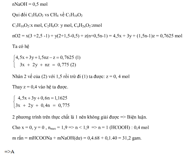 Đốt cháy hỗn hợp X gồm etylen glycol, metan, ancol etylic và một axit no, đơn chức mạch hở Y (trong đó số mol etylen glycol bằng số mol metan) cần vừa đủ 0,7625 mol O2 thu được 0,775 mol CO2. Nếu cho cùng lượng hỗn hợp X trên tác dụng với 200ml dung dịch NaOH 2,5M, rồi cô cạn thì thu được m gam chất rắn khan. Giá trị m là