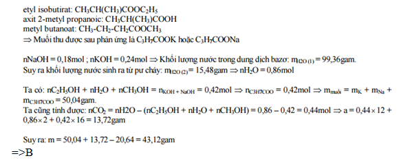 Đun m gam hỗn hợp chứa etyl isobutirat, axit 2-metylpropanoic, metyl butanoat cần dùng vừa đủ 120 gam dung dịch NaOH 6,0% và KOH 11,2%. Cô cạn cẩn thận dung dịch sau phản ứng thu được a gam hỗn hợp hơi các chất. Đốt cháy hoàn toàn a gam hỗn hợp hơi thu được 114,84 gam nước. Giá trị m là ?