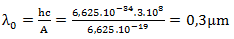 Công thoát của electron khỏi một kim loại là 6,625.10- 19J. Biết h = 6,625.10-34Js; c = 3.108m/s.