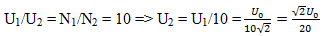 Cuộn sơ cấp và cuộn thứ cấp của một máy biến áp lí tưởng có số vòng dây lần lượt là N1 và N2. Biết N1 = 10N2. Đặt vào hai đầu cuộn sơ cấp một điện áp xoay chiều u = U0coswt thì điện áp hiệu dụng hai đầu cuộn thứ cấp để hở là