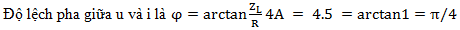 Một đoạn mạch điện xoay chiều gồm điện trở thuần R mắc nối tiếp với một cuộn cảm thuần có cảm kháng với giá trị bằng R. Độ lệch pha của điện áp giữa hai đầu đoạn mạch với cường độ dòng điện trong mạch bằng
