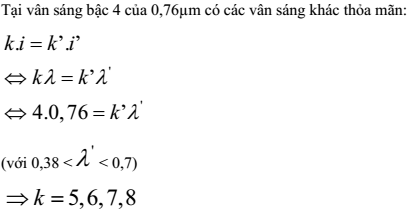 Trong thí nghiệm Iâng (Young) về giao thoa ánh sáng, hai khe được chiếu bằng ánh sáng trắng có bước sóng từ 0,38 mm đến 0,76mm. Tại vị trí vân sáng bậc 4 của ánh sáng đơn sắc có bước sóng 0,76 mm , người ta đặt khe hẹp F của ống chuẩn trực máy quang phổ lăng kính thì trên kính ảnh của buồng tối máy quang phổ này quan sát được