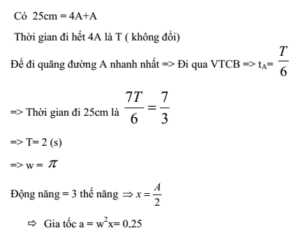 Một vật dao động điều hòa với biên độ A = 5cm, biết khoảng thời gian ngắn nhất để vật đi được quảng đường 25 cm là 7/3 s . Độ lớn gia tốc của khi đi qua vi tri có động năng bằng ba lần thế năng là