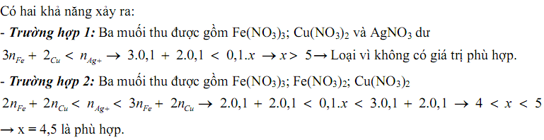 Cho hỗn hợp chứa 5,6 gam Fe và 6,4 gam Cu vào 100 ml dung dịch AgNO3 x M. Sau khi các phản ứng xảy ra hoàn toàn thu được dung dịch chứa 3 muối. Giá trị của x là