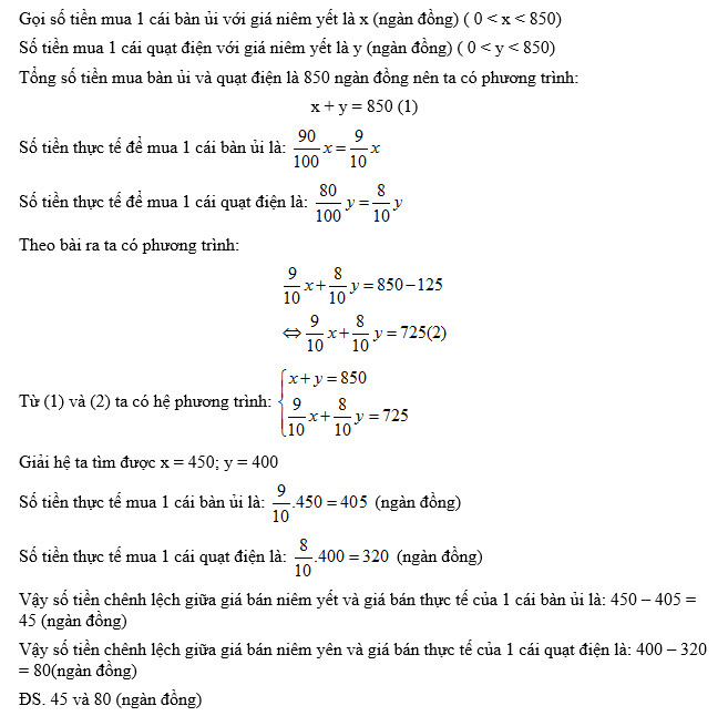 Anh Bình đến siêu thị để mua một cái bàn ủi và một cái quạt điện với tổng số tiền theo giá niêm yết là 850 ngàn đồng. Tuy nhiên, thực tế khi trả tiền, nhờ siêu thị khuyến mãi để tri ân khách hàng nên giá của bàn ủi và quạt điện đã lần lượt giảm bớt 10% và 20% so với giá niêm yết. Do đó, anh Bình đã trả ít hơn 125 ngàn đồng khi mua hai sản phẩm trên. Hỏi số tiền chênh lệch giữa giá bán niêm yết với giá bán thực tế của từng loại sản phẩm mà anh Bình đã mua là bao nhiêu?