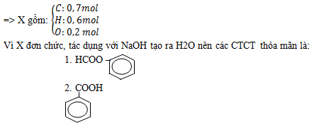 Đốt cháy hoàn toàn 12,2 gam hợp chất hữu cơ X (có chứa vòng benzen) bằng một lượng O2 vừa đủ, sau phản ứng thu được 15,68 lít khí CO2 (đktc) , 5,4 gam H2O ( Không có sản phẩm khác).X là hợp chất hữu cơ đơn chức tác dụng với dung dịch NaOH trong điều kiện thích hợp sản phẩm có tạo ra H2O.Số công thức cấu tạo của X thỏa mãn tính chất trên là: