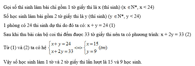 Trong kì thi tuyển sinh vào lớp 10 THPT tỉnh Nghệ An, tại một phòng có 24 thí sinh dự thi. Các thí sinh đều làm bài trên tờ giấy thi của mình. Sau khi thu bài cán bộ coi thi đếm được 33 tờ giấy thi và bài làm của thí sinh chỉ gồm 1 tờ hoặc 2 tờ giấy thi. Hỏi trong phòng thi đó có bao nhiêu thí sinh bài làm gồm một tờ giấy thi, bao nhiêu thí sinh bài làm gồm hai tờ giấy thi? (Tất cả các thí sinh đều nạp bài thi)