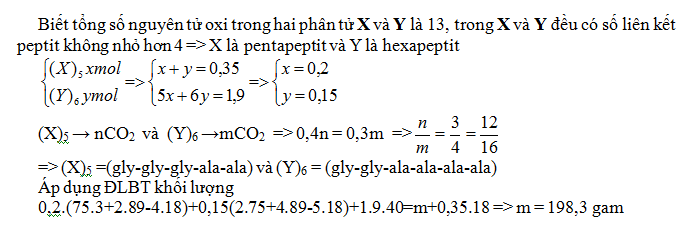 Cho 0,35 mol hỗn hợp T gồm hai peptit mạch hở là X (x mol) và Y (y mol), đều tạo bởi glyxin và alanin. Đun nóng 0,35 mol T trong lượng dư dung dịch NaOH thì có 1,9 mol NaOH phản ứng và thu được dung dịch chứa m gam muối. Mặt khác, nếu đốt cháy hoàn toàn x mol X hoặc y mol Y thì đều thu được cùng số mol CO2. Biết tổng số nguyên tử oxi trong hai phân tử X và Y là 13, trong X và Y đều có số liên kết peptit không nhỏ hơn 4. Giá trị của m là
