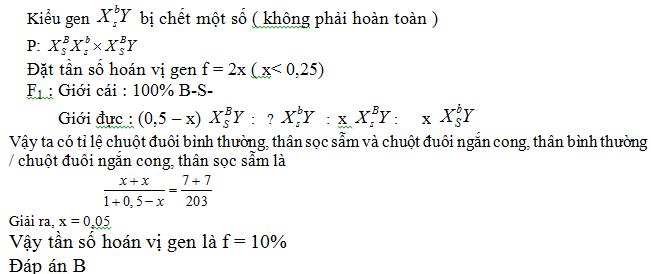 Cho chuột cái P có kiểu gen XBS Xbs lai với chuột đực có kiểu gen XBSY thu được F1 có 203 chuột đuôi ngắn cong, thân có sọc sẫm; 53 chuột có kiểu hình bình thường; 7 chuột đuôi bình thường, thân có sọc sẫm và 7 chuột đuôi ngắn cong, màu thân bình thường