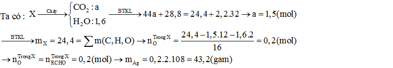 Đốt cháy hoàn toàn 24,4 gam hỗn hợp X gồm C3H6, C3H8, C4H10, CH3CHO, CH2=CH-CHO cần vừa đủ 49,28 lít khí O2 (đktc), sau phản ứng thu được 28,8 gam H2O. Mặt khác, lấy toàn bộ lượng X trên sục vào dung dịch AgNO3/NH3 dư, đun nóng thấy xuất hiện m gam kết tủa (các phản ứng xảy ra hoàn toàn). Giá trị của m là