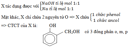 Chất hữu cơ X có công thức phân tử C7H8O2, chứa vòng benzen, phản ứng với NaOH theo tỉ lệ mol