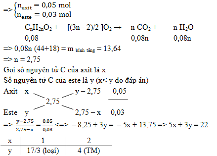 Hỗn hợp Y gồm hai hợp chất hữu cơ phản ứng vừa đủ với 400 ml dung dịch NaOH 0,2M thu được dung dịch Z và 0,03 mol hơi ancol T. Nếu đốt cháy hết hỗn hợp Y trên rồi hấp thụ hết sản phẩm cháy vào bình đựng dung dịch vôi trong (dư) thì khối lượng bình tăng 13,64 gam. Hai chất trong Y là