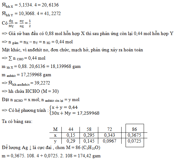 Hỗn hợp X gồm H2 và 2 anđehit (no, đơn chức, mạch hở, M<88). Tỉ khối của X so với Heli là 5,1534. Đun nóng hỗn hợp X (có xúc tác thích hợp) đến phản ứng hoàn toàn, thu được hỗn hợp Y có tỉ khối so với Heli là 10,3068. Nếu cho 0,88 mol X phản ứng với dung dịch AgNO3/NH3 dư, thu được m gam kết tủa. Giá trị lớn nhất của m là