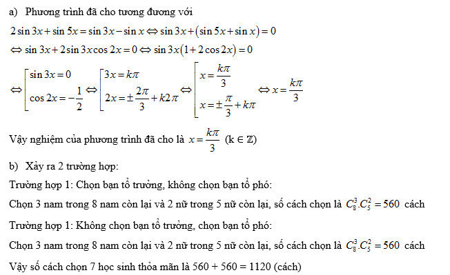 a) Giải phương trình: 2sin3x + sin5x = 2cos2x.sinx b) Một tổ gồm 9 học sinh nam và 6