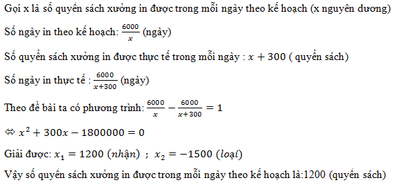 Một xưởng có kế hoạch in xong 6000 quyển sách giống nhau trong một thời gian quy định, biết số quyển sách in được trong một ngày là bằng nhau. Để hoàn thành sớm kế hoạch , mỗi ngày xưởng đã in nhiều hơn 300 quyển sách so với số quyển sách phải in trong kế hoạch, nên xưởng in xong 6000 quyển sách nói trên sớm hơn kế hoạch 1 ngày.