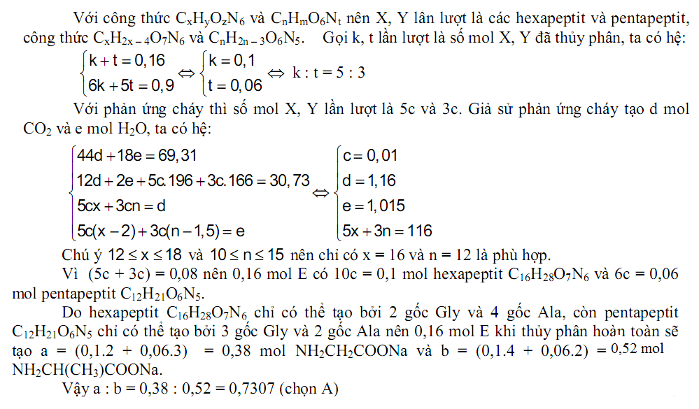 Đun nóng 0,16 mol hỗn hợp E gồm 2 peptit X ( CxHyOzN6 ) và Y ( CnHmO6Nt ) cần dùng 600 ml dung dịch NaOH 1,5M chỉ thu được dung dịch chứa a mol muối của glyxin và b mol muối của alanin. Mặt khác đốt cháy 30,73 gam E bằng O2 vừa đủ thu được hỗn hợp CO2; H2O và N2 trong đó tổng khối lượng CO2 và H2O là 69,31 gam. Tỉ lệ a : b gần nhất với