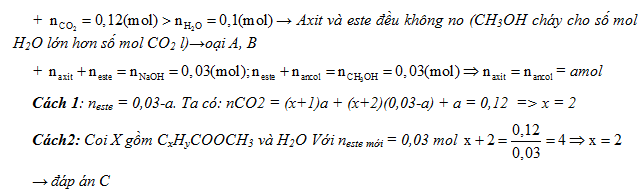 Đốt cháy hoàn toàn 2,76 gam hỗn hợp X gồm CxHyCOOH, CxHyCOOCH3, CH3OH thu được 2,688 lít CO2 (đktc) và 1,8 gam H2O. Mặt khác, cho 2,76 gam X phản ứng vừa đủ với 30 ml dung dịch NaOH 1M, thu được 0,96 gam CH3OH. Công thức của CxHyCOOH là