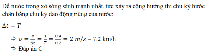 Một người xách một xô nước đi trên đường, mỗi bước đi dài 40cm. Chu kì dao động riêng của nước trong xô là 0,2s. Để nước trong xô sóng sánh mạnh nhất thì người đó phải đi với vận tốc là