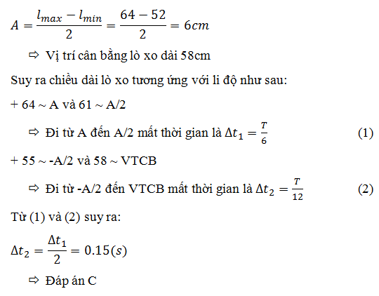Con lắc lò xo nằm ngang dao động điều hòa với chiều dài lò xo biến thiên từ 52 cm đến 64 cm. Thời gian ngắn nhất chiều dài lò xo giảm từ 64 cm đến 61 cm là 0,3 s. Thời gian ngắn nhất để chiều dài lò xo tăng từ 55cm đến 58cm là