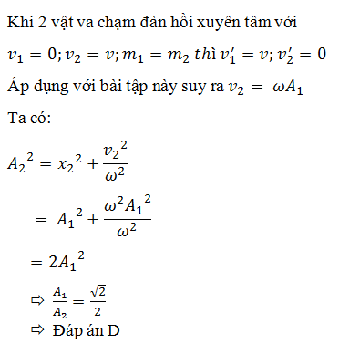 Một con lắc lò xo đang dao động điều hòa trên mặt phẳng nằm ngang, nhẵn với biên độ A1. Đúng lúc vật M đang ở vị trí biên thì một vật m có khối lượng bằng khối lượng vật M, chuyển động theo phương ngang với vận tốc v0 bằng vận tốc cực đại của vật M, đến va chạm với M. Biết va chạm giữa hai vật là đàn hồi xuyên tâm, sau va chạm vật M tiếp tục dao động điều hòa với biên độ A2. Tỉ số biên độ dao động của vật M trước và sau va chạm là