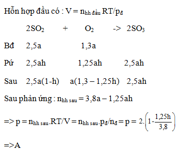 Trong một bình kín dung tích V lít không đổi có chứa 1,3a mol O2 và 2,5a mol SO2 ở 100oC, 2 atm (có mặt xúc tác V2O5), nung nóng bình một thời gian sau đó làm nguội tới 100oC, áp suất trong bình lúc đó là p; hiệu suất phản ứng tương ứng là h. Mối liên hệ giữa p và h được biểu thị bằng biểu thức