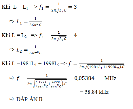 Mạch dao động LC lý tưởng có L thay đổi được, C cố định. Khi L=L1 thì tần số dao động do mạch phát ra là 3MHz. Khi L=L2 thì tần số do mạch phát ra là 4MHz. Khi L=1981L1+1998L2 thì tần số dao động do mạch phát ra gần giá trị nào nhất