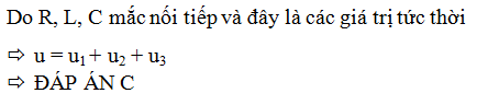 Mạch RLC nối tiếp. Đặt điện áp xoay chiều u=U0cos(ωt) (V) vào hai đầu đoạn mạch. Gọi u1, u2, u3 lần lượt là điện áp tức thời hai đầu điện trở thuần, cuộn dây và tụ điện. Chọn biểu thức đúng: