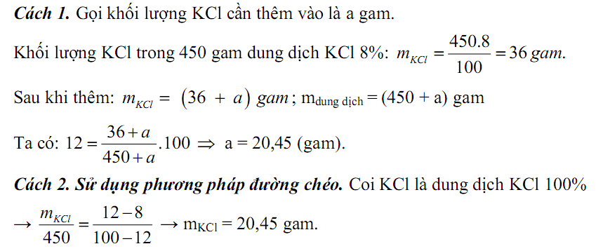 Khối lượng KCl cần thêm vào 450 gam dung dịch KCl 8% để thu được dung dịch KCl 12% là