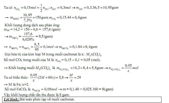 Hoà tan 14,2 gam hỗn hợp X gồm MgCO3 và một muối cacbonat của kim loại M vào một lượng vừa đủ axit HCl 7,3% thu được dung dịch Y và 3,36 lít khí CO2 (đktc). Nồng độ MgCl2 trong Y là 6,028%. Cho dung dịch NaOH dư vào dung dịch Y, lọc lấy kết tủa đem nung ngoài không khí đến khối lượng không đổi thì thu được m gam chất rắn. Giá trị của m bằng
