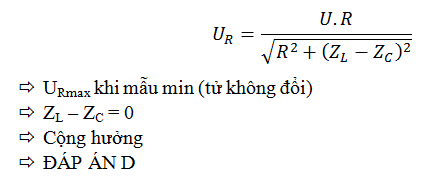 ft vào hai đầu đoạn mạch gồm điện trở thuần R, cuộn cảm thuần có độ tự cảm L và tụ điện có điện dung C mắc nối tiếp. Gọi UR, UL, UC lần lượt là điện áp hiệu dụng giữa hai đầu điện trở, giữa hai đầu cuộn cảm và giữa hai đầu tụ điện. Trường hợp nào sau đây sẽ làm cho mạch xảy ra cộng hưởng?