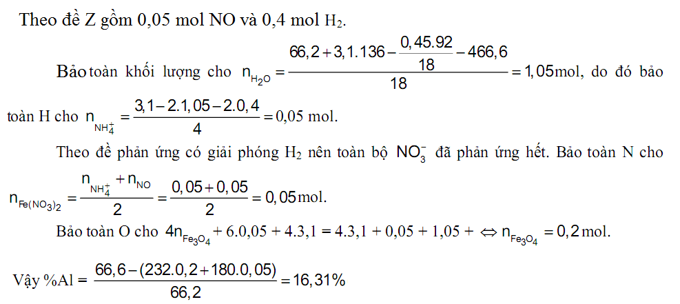 Cho 66,2 gam hỗn hợp X gồm Fe3O4 ; Fe(NO3)2, Al tan hoàn toàn trong dung dịch chứa 3,1 mol KHSO4 loãng. Sau khi các phản ứng xảy ra hoàn toàn thu được hỗn hợp Y chỉ chứa 466,6 gam muối sunfat trung hòa và 10,08 lít (đktc) khí Z gồm 2 khí trong đó có một khí không màu hóa nâu trong không khí. Biết tỉ khối hơi của Z so với Heli là 23/18. Phần trăm của Al trong X gần nhất với giá trị nào dưới đây ?