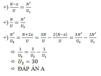 Có ba máy biến áp lý tưởng cuộn thứ cấp của các máy có số vòng dây bằng nhau. Số vòng dây ở cuộn sơ cấp của máy 2 nhiều hơn số vòng dây ở cuộn sơ cấp của máy 1 là x vòng, nhưng lại ít hơn số vòng dây ở cuộn sơ cấp của máy 3 là 2x vòng. Nếu lần lượt mắc vào cuộn sơ cấp của máy 1 máy 2 và máy 3 một điện áp xoay chiều có giá trị hiệu dụng không đổi U thì điện áp hiệu dụng ở hai đầu cuộn thứ cấp để hở của máy 1, máy 2 và máy 3 lần lượt là 60 V, 45V và U3. Giá trị U3 bằng