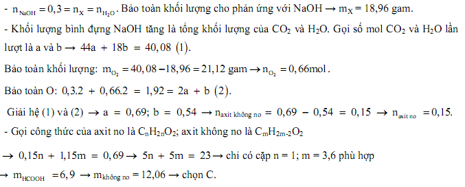 Hỗn hợp X chứa ba axit cacboxylic đều đơn chức, mạch hở, gồm một axit no và hai axit không no đều có một liên kết đôi (C=C). Cho m gam X tác dụng vừa đủ với 150 ml dung dịch NaOH 2M, thu được 25,56 gam hỗn hợp muối. Đốt cháy hoàn toàn m gam X, hấp thụ toàn bộ sản phẩm cháy bằng dung dịch NaOH dư, khối lượng dung dịch tăng thêm 40,08 gam. Tổng khối lượng của hai axit cacboxylic không no trong m gam X là: