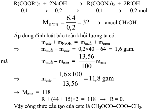 Cho 0,1 mol este tạo bởi 2 lần axit vàtác dụng hoàn toàn với NaOH thu được 6,4 gam rượu và một lượng mưối có khối lượng nhiều hơn lượng este là 13,56% (so với lượng este). Xác định công thức cấu tạo của este.