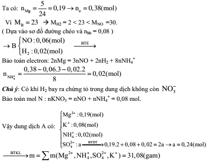 Cho 5 gam bột Mg vào dung dịch hỗn hợp KNO3 và H2SO4, đun nhẹ, trong điều kiện thích hợp, đến khi phản ứng xảy ra hoàn toàn thu được dung dịch A chứa m gam muối; 1,792 lít hỗn hợp khí B ( đktc) gồm hai khí không màu, trong đó có một khí hóa nâu ngoài không khí và còn lại 0,44 gam chất rắn không tan. Biết tỉ khối hơi của B đối với H2 là 11,5. Giá trị của m là