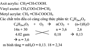 Đốt cháy hoàn toàn 4,02 gam hỗn hợp gồm axit acrylic, vinyl axetat và metyl metacrylat rồi cho