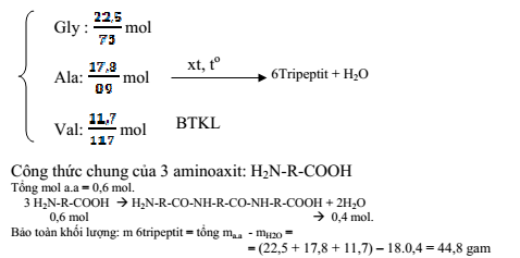 Đun nóng hỗn hợp gồm : 22,5 gam glyxin ; 17,8 gam alanin ; 11,7 gam valin, với xúc tác thích hợp, sau