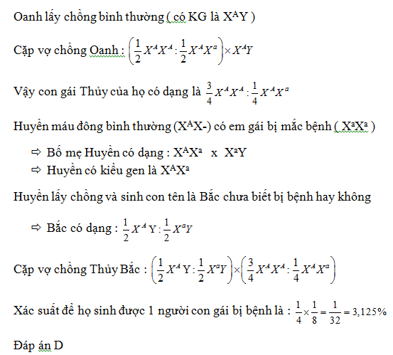 Ở người, bệnh máu khó đông do alen lặn a nằm trên vùng không tương đồng của nhiễm sắc thể giới tính X quy định, alen trội A quy định máu đông bình thường. Oanh không mắc bệnh máu khó đông có em trai là Hòa mắc bệnh này và người mẹ là Hằng, bố là Quý đều bình thường. Oanh lấy một người chồng bình thường tên là Thuận và họ sinh ra được một bé gái tên Thủy. Huyền máu đông bình thường nhưng có em gái là Mỹ mắc bệnh; Huyền lấy một người chồng là Nam mắc bệnh máu khó đông và họ sinh được một người con trai là Bắc. Thủy và Bắc lớn lên và kết hôn với nhau. Biết không xảy ra đột biến. Theo lí thuyết, xác suất để Thủy và Bắc sinh được một đứa con gái mặc bệnh là: