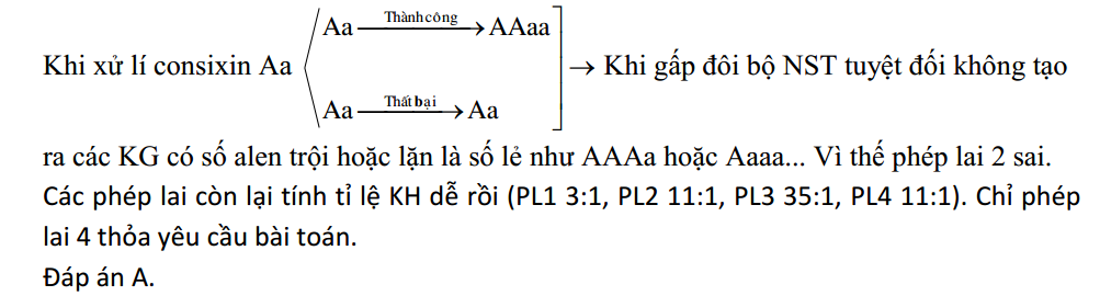 Ở cà chua, gen qui định màu sắc quả nằm trên nhiễm sắc thể thường, alen A qui định quả màu đỏ trội hoàn toàn so với alen a qui định quả màu vàng. Cho cây lưỡng bội thuần chủng đỏ lai với lưỡng bội vàng F1 toàn đỏ. Dùng cônsixin tứ bội hóa F1 rồi cho F1 lai nhau, F2 thu được tỉ lệ 11 đỏ: 1 vàng. Có mấy phép lai sau đây cho tỉ lệ KH như trên