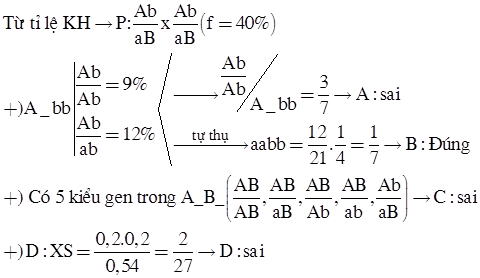 Cho biết ở một loài thực vật, mỗi gen quy định một tính trạng, alen trội là trội hoàn toàn, xét 2 cặp gen Aa, Bb. Cho P tự thụ phấn thu được F1 có tỉ lệ kiểu hình:0.54A-B- : 0.21aaB- : 0,21A-bb: 0,04 aabb . Dự đoán nào sau đây đúng?