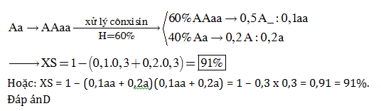 Ở một loài thực vật, gen A quy định quả đỏ trội hoàn toàn so với alen a quy định quả vàng. Lai cây thuần chủng lưỡng bội quả đỏ với cây lưỡng bội quả vàng được F1. Xử lý F1 bằng cônsixin, sau đó cho toàn bộ F1 này giao phấn ngẫu nhiên với nhau được F2. Giả thiết rằng thể tứ bội chỉ tạo ra giao tử lưỡng bội, khả năng sống và thụ tinh của các loại giao tử là ngang nhau, hợp tử phát triển bình thường và hiệu quả việc xử lí hoá chất cônsixin gây đột biến lên F1 đạt tỉ lệ thành công là 60%. Theo lý thuyết, tỉ lệ kiểu hình quả đỏ ở F2 là: