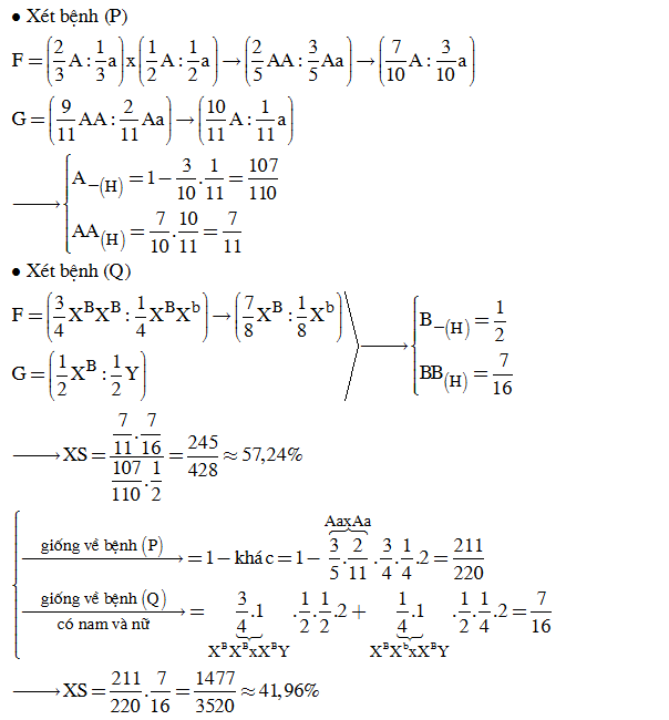 (4) Xác suất để cặp vợ chồng (F) và (G) sinh thêm 2 đứa con có cả trai lẫn gái và đều có kiểu hình giống nhau về cả 2 bệnh trên là 41,96%.