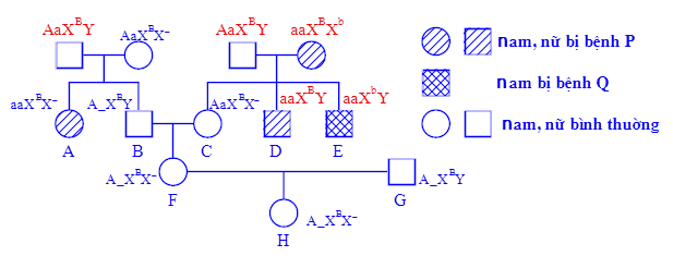 Ở một quần thể người, bệnh P do một trong hai alen của một gen qui định; bệnh Q do alen lặn nằm trên vùng không tương đồng của NST X qui định, alen trội tương ứng qui định kiểu hình bình thường. Một cặp vợ chồng đều bình thường sinh được người con gái (A) bị bệnh P nhưng không bệnh Q và một người con trai (B) bình thường. Một gia đình khác có người chồng bình thường kết hôn với người vợ bị bệnh P, họ sinh được 3 người con gồm người con gái (C) bình thường, người con trai (D) chỉ bị bệnh P và người con trai (E) bị cả 2 bệnh. (B) và (C) kết hôn với nhau sinh ra người con gái (F) bình thường. (F) kết hôn với 1 người đàn ông (G) bình thường (người (G) này đến từ một quần thể đang cân bằng di truyền về gen gây bệnh P, cứ 100 người có 1 người bị bệnh này), họ sinh được 1 đứa con gái (H) không bị bệnh cả 2 bệnh trên. Biết rằng không có đột biến mới ở tất cả những người trong các gia đình trên. Dựa vào các thông tin trên, hãy cho biết có bao nhiêu nhận định đúng sau đây?