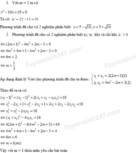 Cho phương trình x2 – 2(2m + 1)x + 4m2 – 2m + 3 = 0 (m là tham số) 1) Giải phương trình với