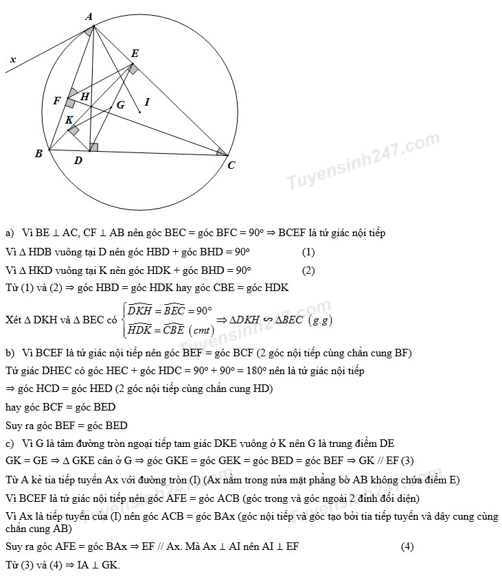 Cho tam giác ABC có ba góc nhọn (AB < AC) nội tiếp đường tròn tâm I. Gọi H là trực tâm và D, E, F lần lượt là chân các đường cao kẻ từ A, B, C của tam giác ABC. Kẻ DK vuông góc đường thẳng BE tại K.