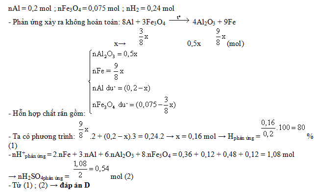 Trộn 5,4 gam bột Al với 17,4 gam bột Fe3O4 rồi tiến hành phản ứng nhiệt nhôm (trong điều kiện không có không khí). Giả sử chỉ xảy ra phản ứng khử Fe3O4 thành Fe. Hòa tan hoàn toàn chất rắn sau phản ứng bằng dung dịch H2SO4 loãng (dư) thu được 5,376 lít khí H2 (ở đktc). Hiệu suất phản ứng nhiệt nhôm và số mol H2SO4 đã phản ứng là: