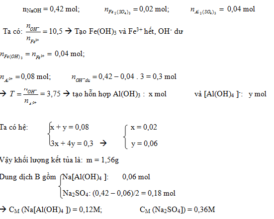 Dung dịch A chứa 16,8g NaOH cho tác dụng với dung dịch chứa 8g Fe2(SO4)3. Thêm tiếp vào đó 13,68g Al2(SO4)3 thu được 500ml dung dịch B và m gam kết tủa. Kết luận nào sau đây sai?
