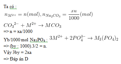 Để loại bỏ toàn bộ Ca2+ , Mg2+ trong V ml nước cứng người ta dùng vừa đủ x ml dung dịch Na2CO3 nồng độ a mol/lit hoặc y ml dung dịch Na3PO4 b mol/lit. Biểu thức liên hệ x, y, a, b là