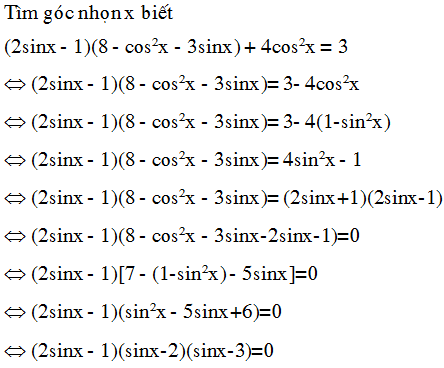 Tìm góc nhọn x biết: (2sinx - 1)(8 - cos2x - 3sinx) + 4cos2x = 3